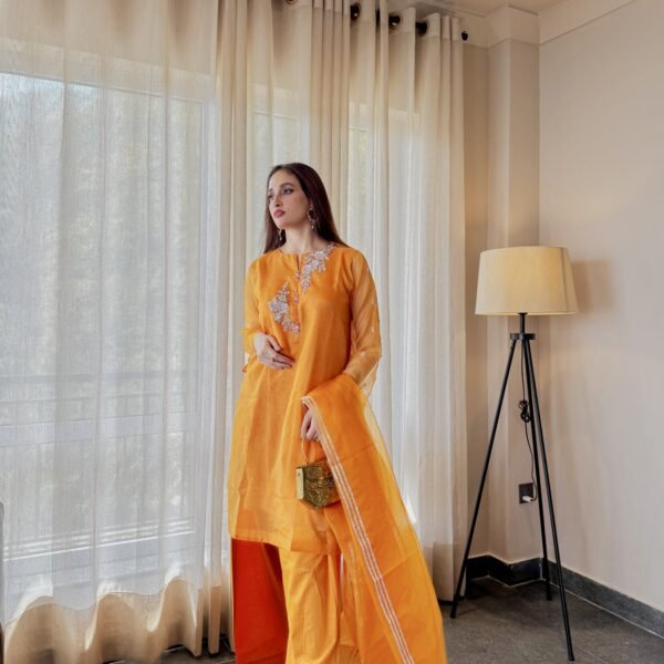 3 Piece Orange Shirt Dupatta & Farshi Shalwar