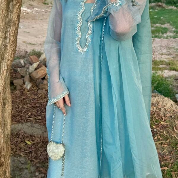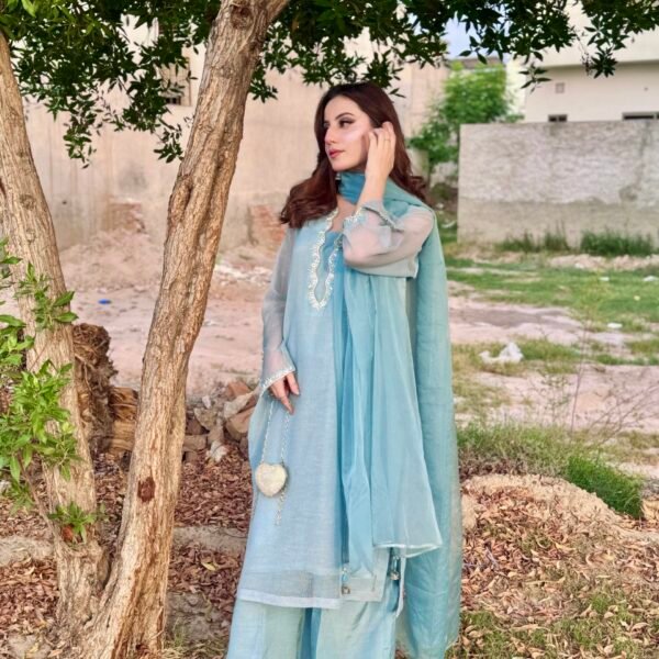 3 Piece Blue Texture Organza Shirt Dupatta & Trouser