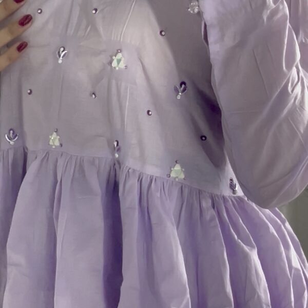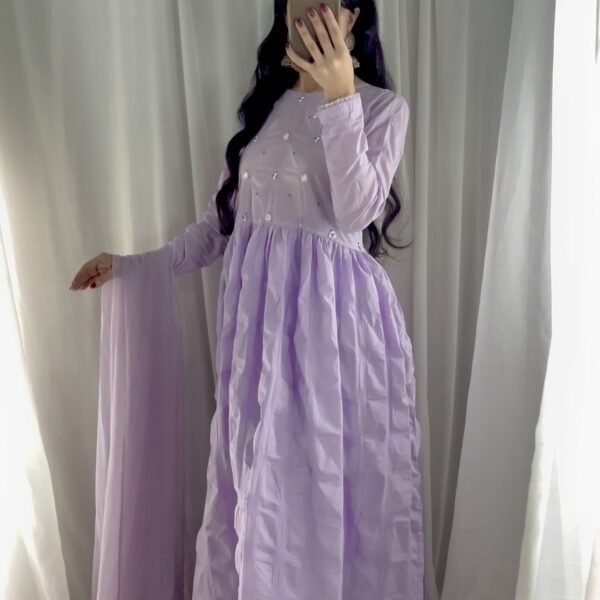 This elegant 3-piece outfit features a beautifully stitched lawn frock paired with a matching lawn trouser and a soft chiffon dupatta. The frock is delicately hand-embellished with mirror work, wool thread embroidery, pearls, and sequins, giving it a refined and graceful look. The pastel lavender shade adds a touch of freshness, while the flowy silhouette makes it both comfortable and stylish. A perfect choice for festive gatherings, semi-formal events, or a graceful day look.