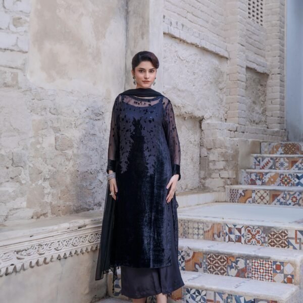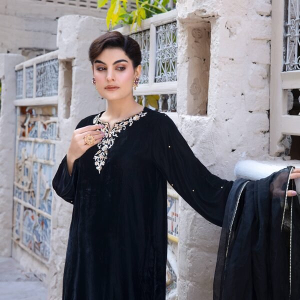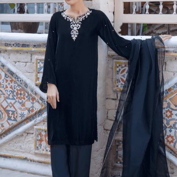 3 Piece Black Velvet Shirt, Dupatta & Trouser