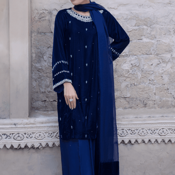 3 Piece Navy Blue Velvet, Shirt, Dupatta & Plazo