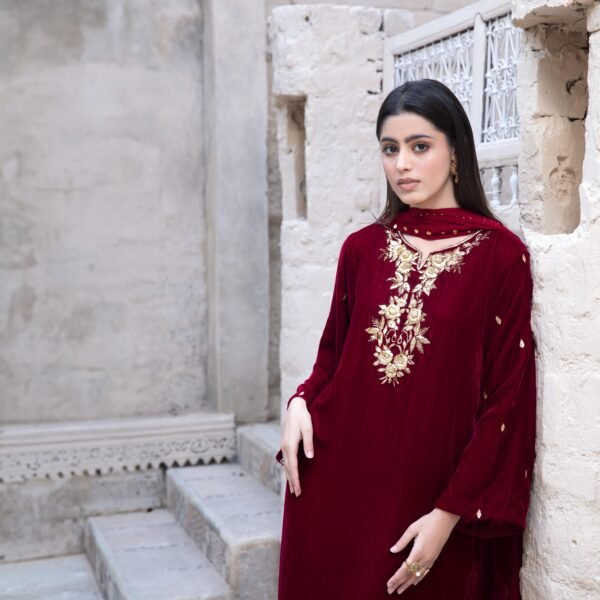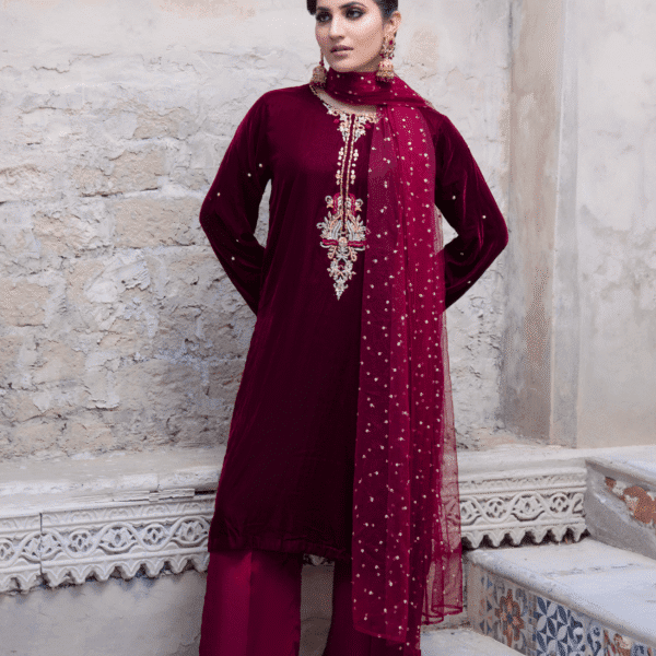 3 Piece Maroon Velvet Shirt, Dupatta & Trouser