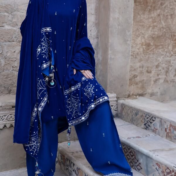 3 Piece Royal Blue Velvet Shirt, Dupatta & Plazo