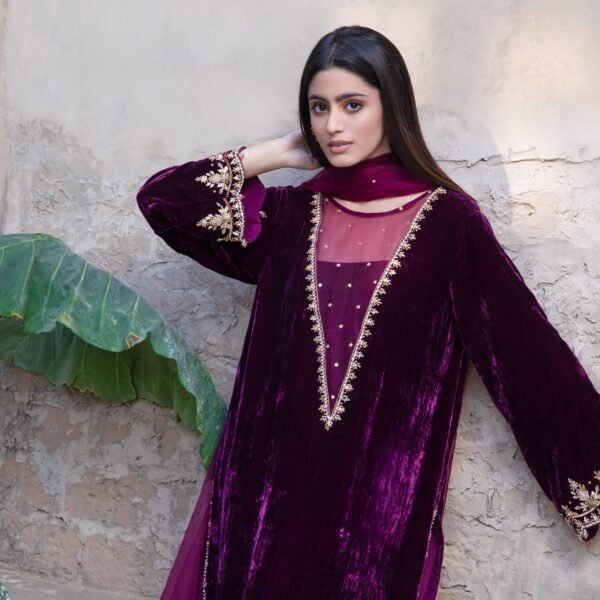3 Piece Purple Velvet Shirt, Dupatta & Trouser