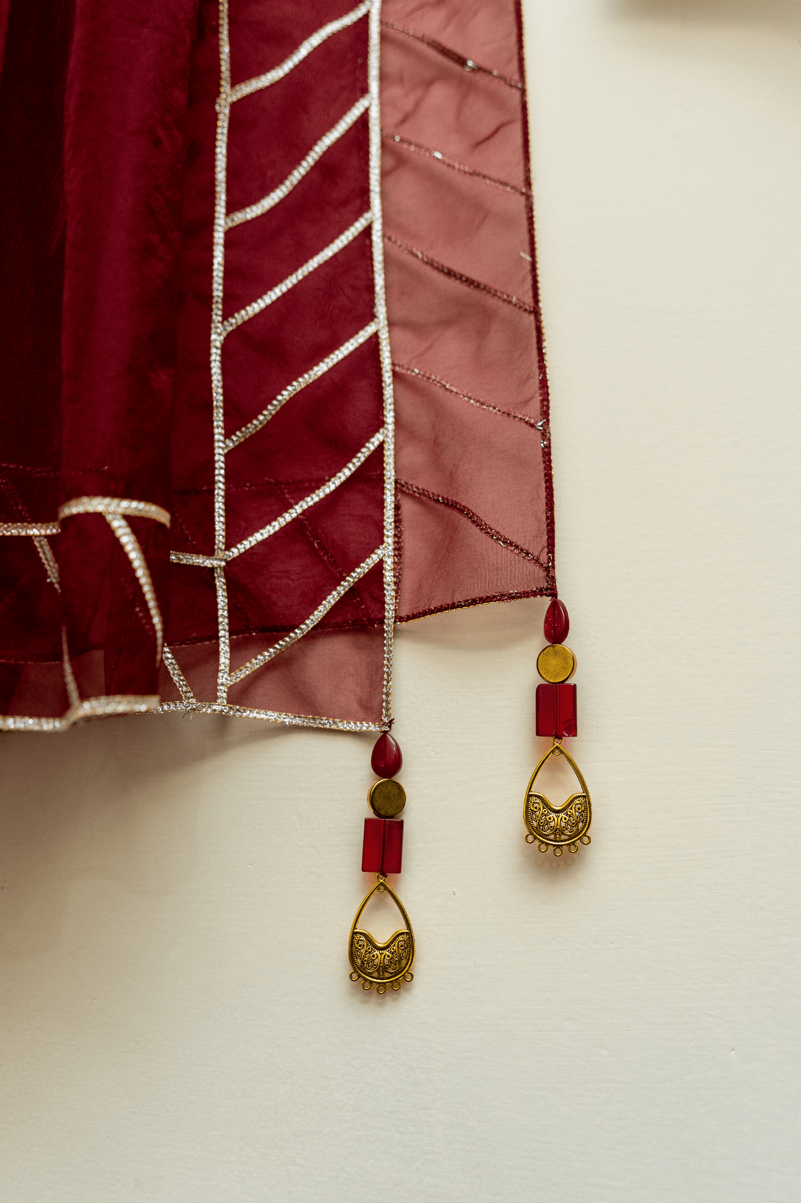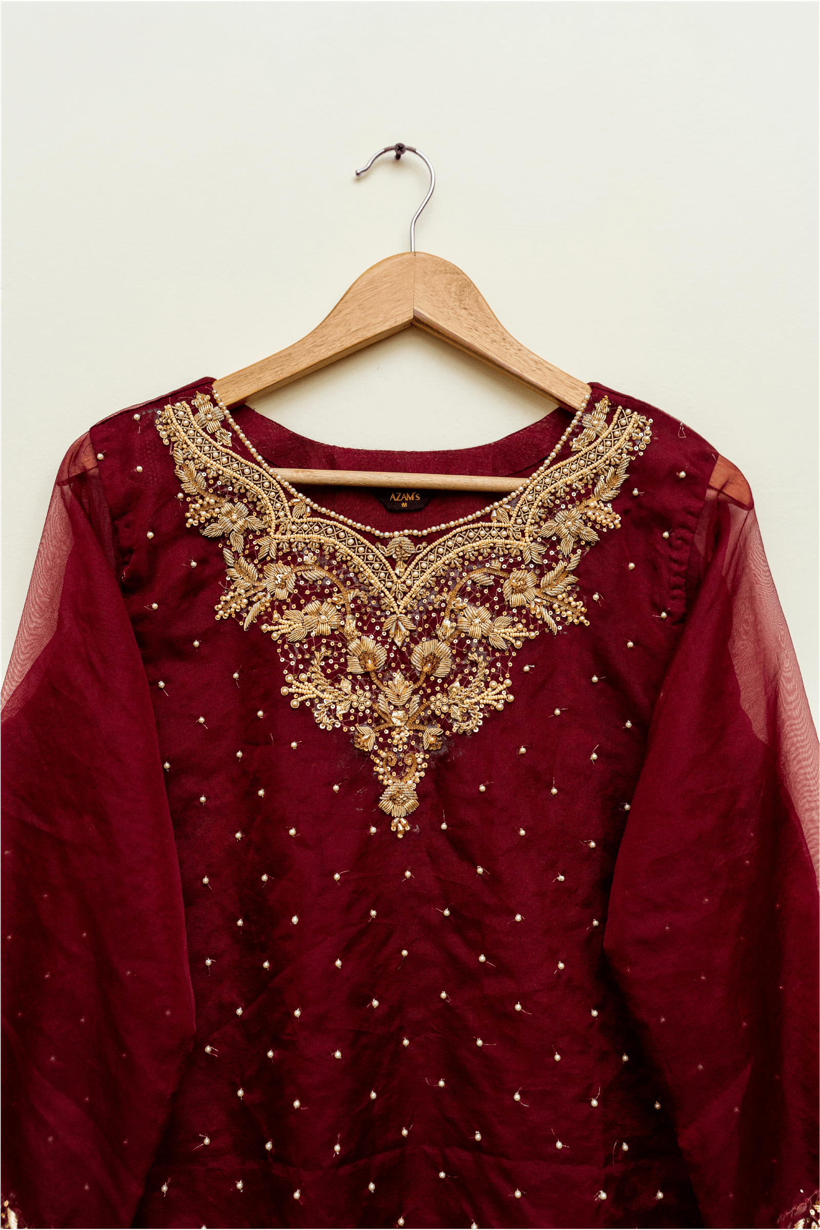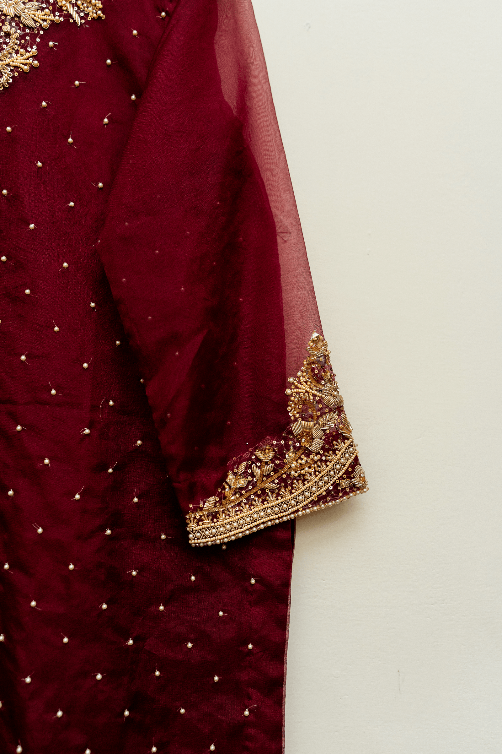 Maroon Three-Piece Ensemble features an organza shirt with hand embellishments, dabka work, crystals, sitara, and pearls, paired with a raw silk plazo and a matching organza dupatta. This regal outfit blends elegance and grandeur, perfect for any special occasion.