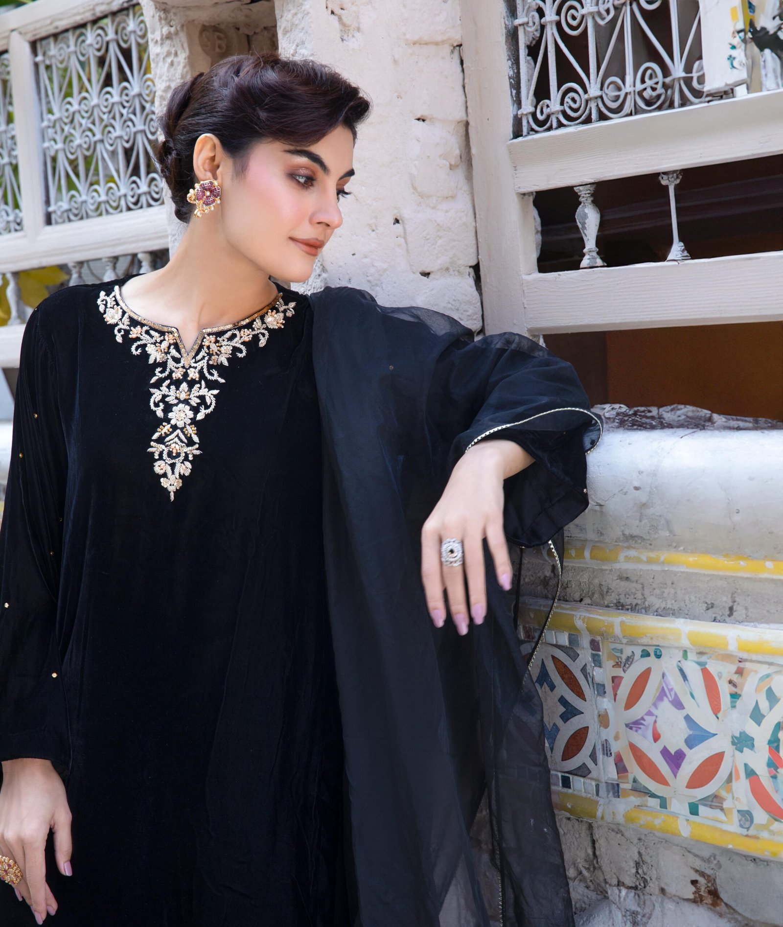 3 Piece Black Velvet Shirt, Dupatta & Trouser