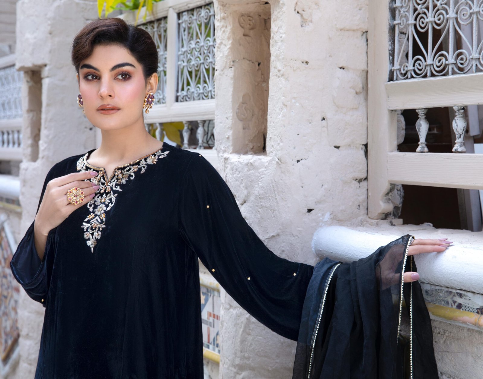 3 Piece Black Velvet Shirt, Dupatta & Farshi Shalwar Original price was: ₨ 24,700.Current price is: ₨ 18,500.