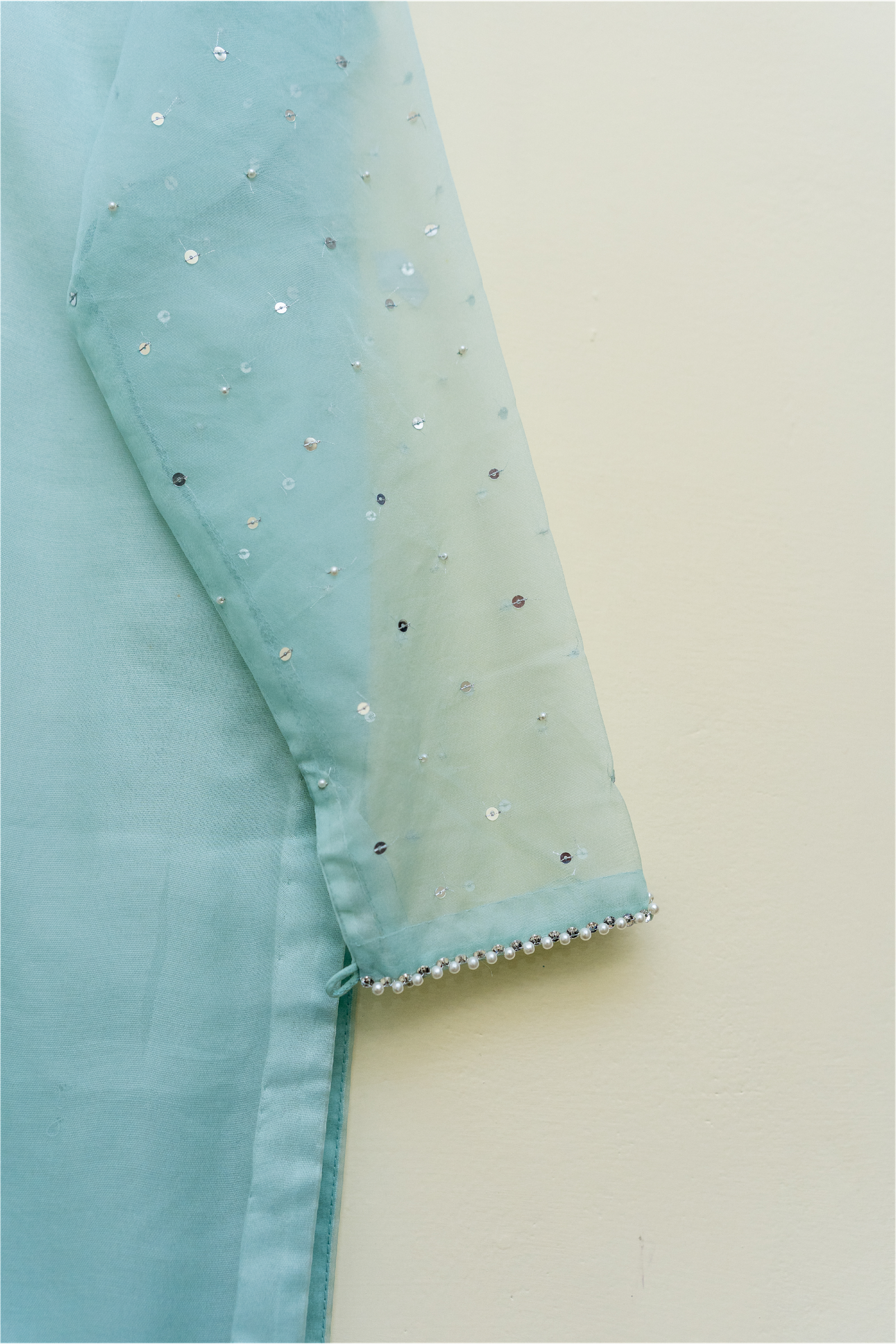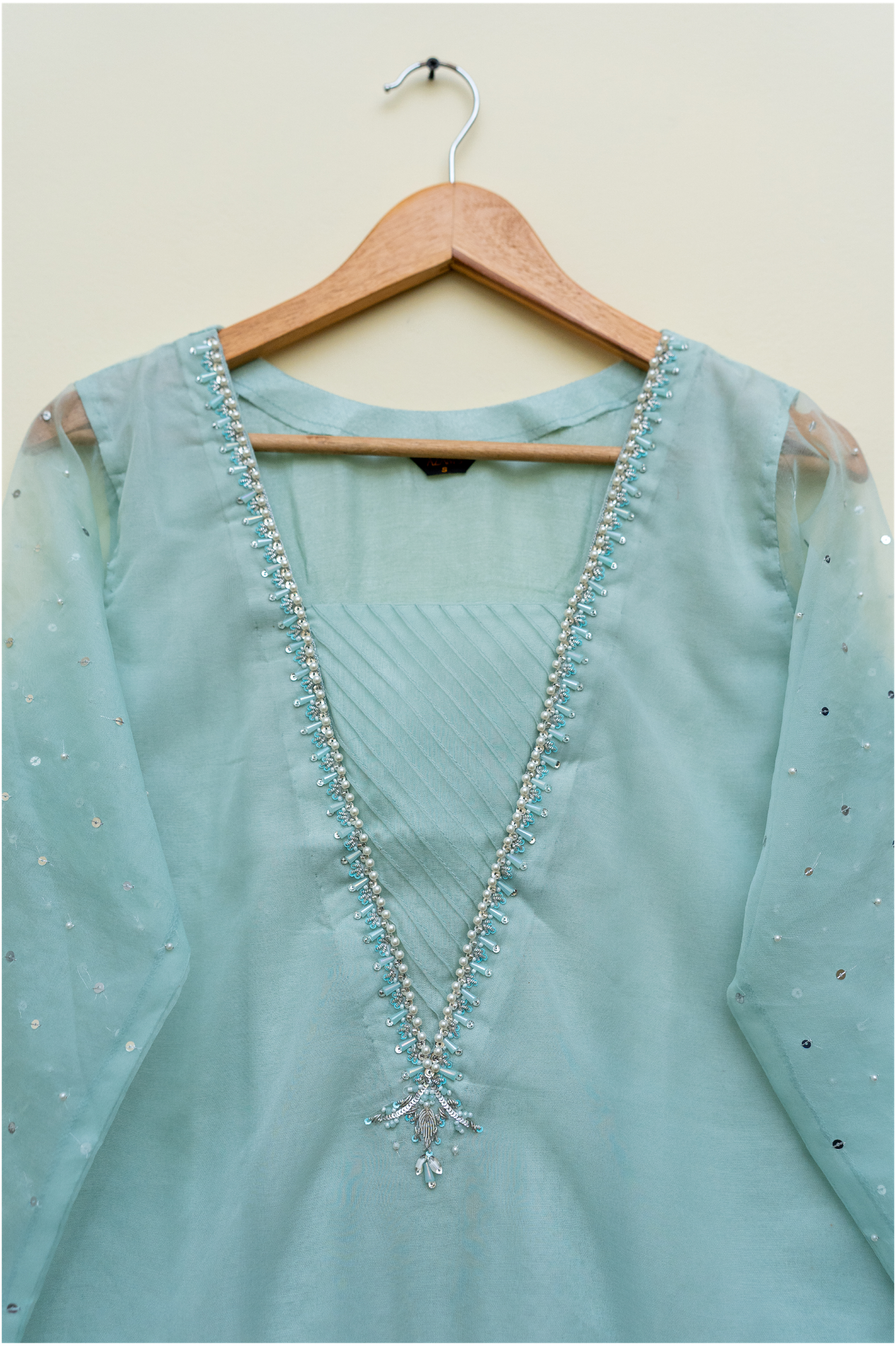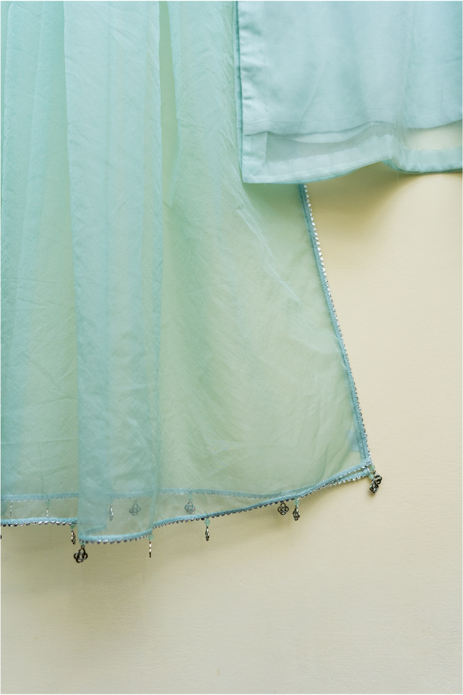 Ice Blue Three-Piece Ensemble features hand embellishments on the neckline and sleeves, paired with raw silk trousers and an organza dupatta with tassels. Soft, elegant, and perfect for graceful occasions.