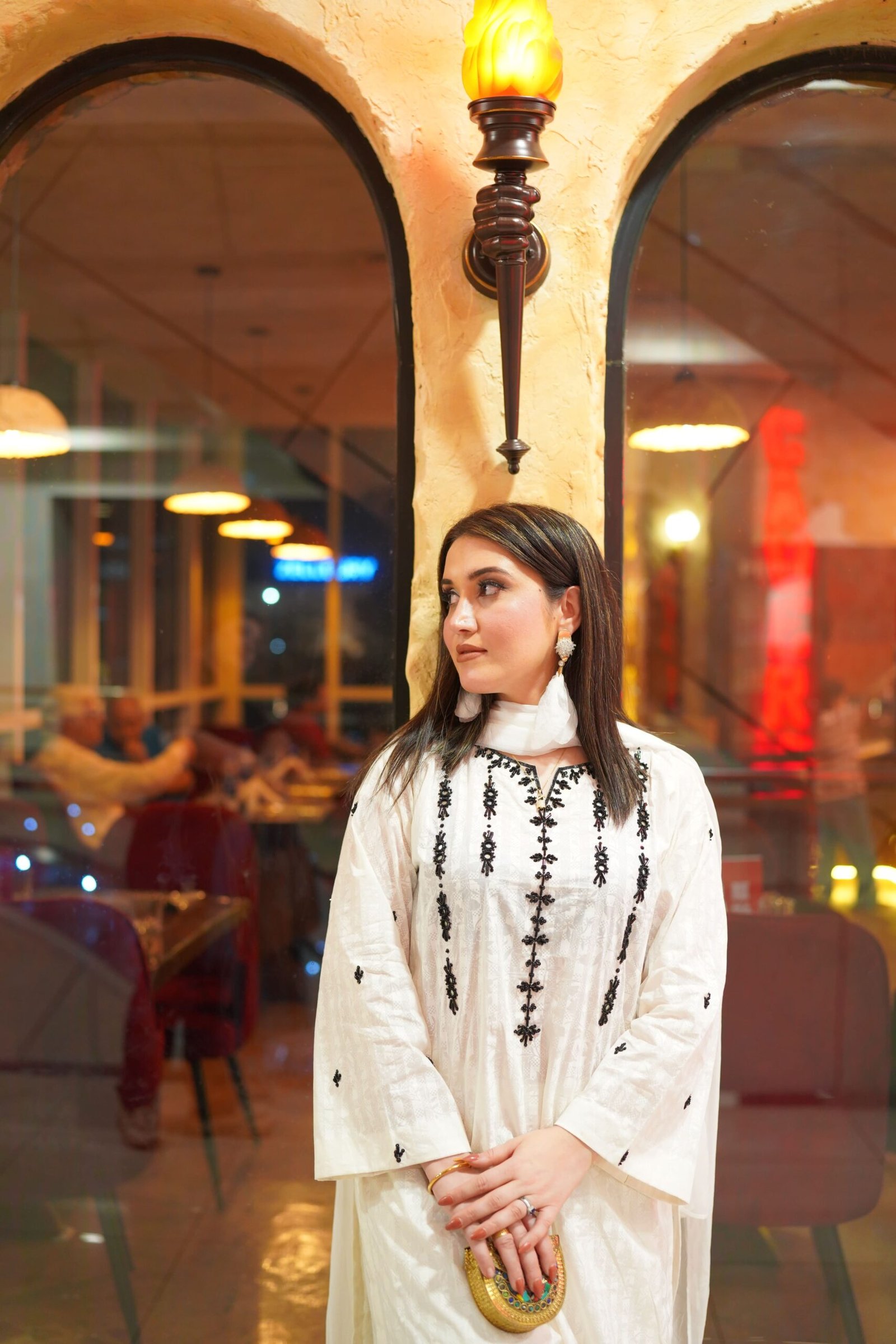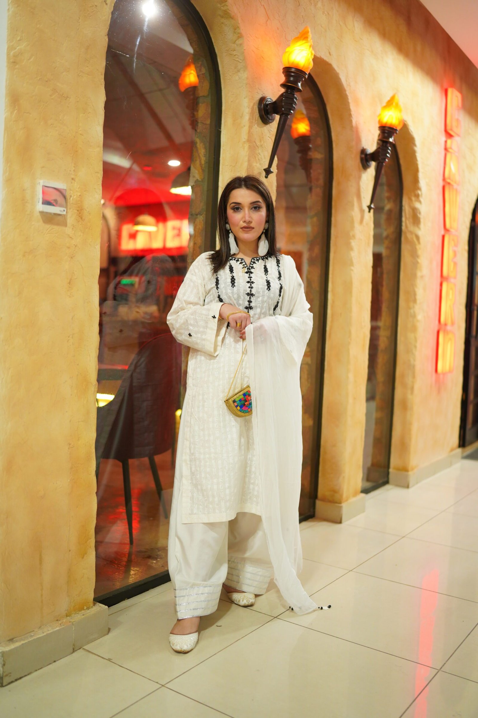 Purple Three-Piece Ensemble is a graceful celebration of modern elegance and traditional detailing. The organza shirt features a beautifully crafted lops-style neckline, enhanced with delicate hand embellishments that add a refined sparkle. The sleeves are also intricately embellished, giving the outfit a balanced and luxurious finish.