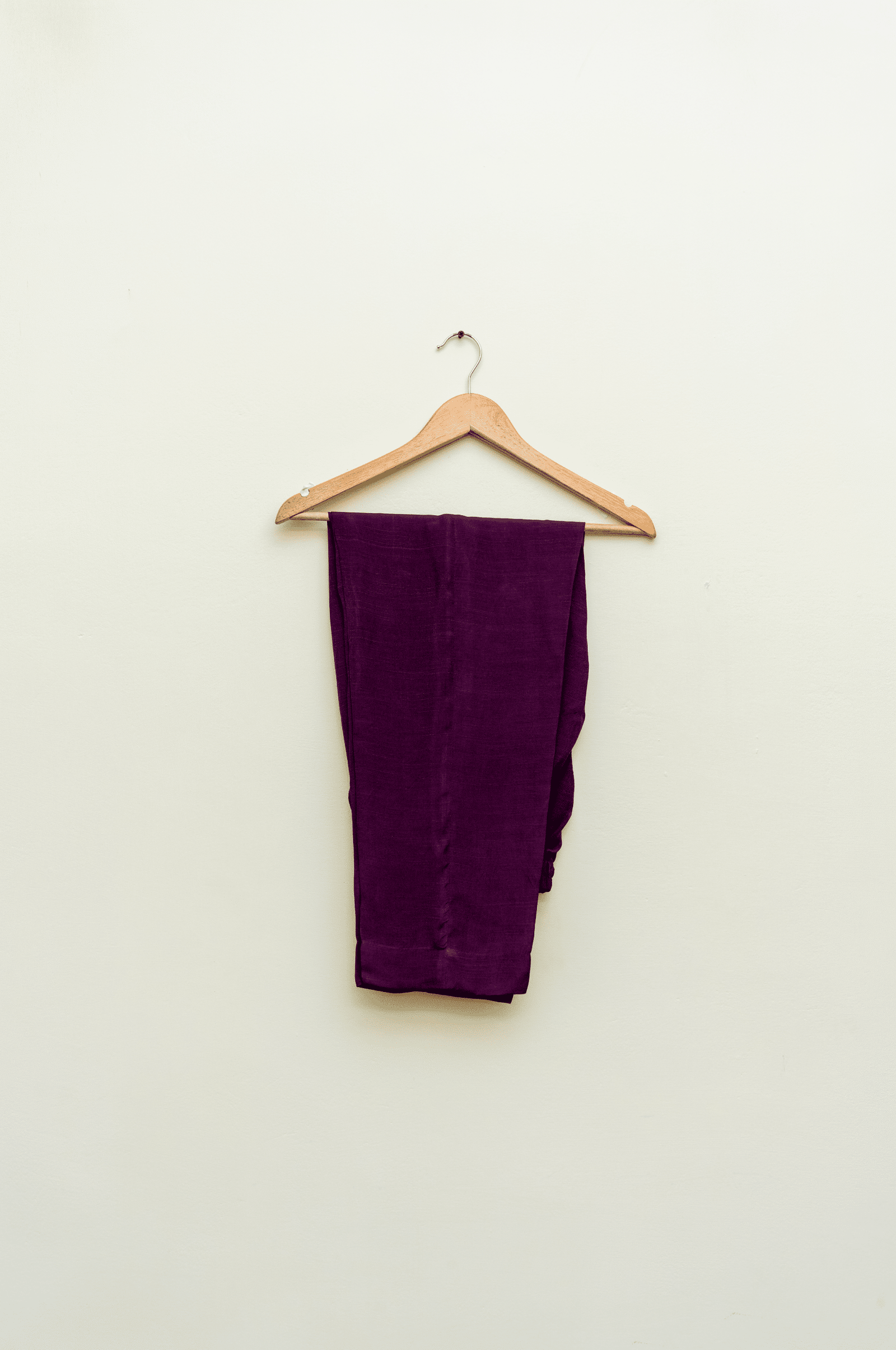 Paired with a raw silk trouser, offering a structured and elegant silhouette, and a matching organza dupatta adorned with tassels, this ensemble is perfect for formal and semi-formal occasions. The rich purple hue adds depth and royalty to the entire look.
