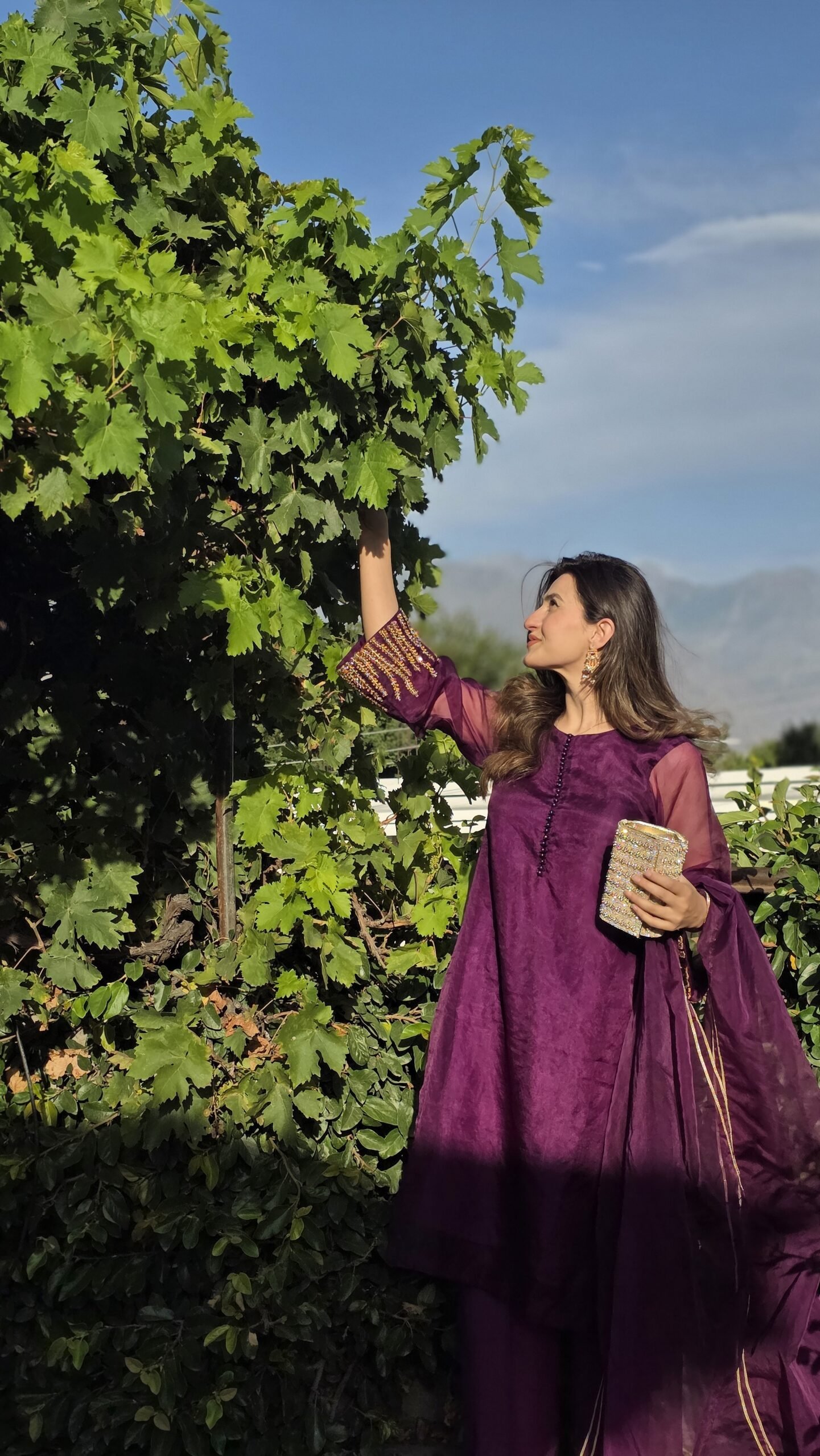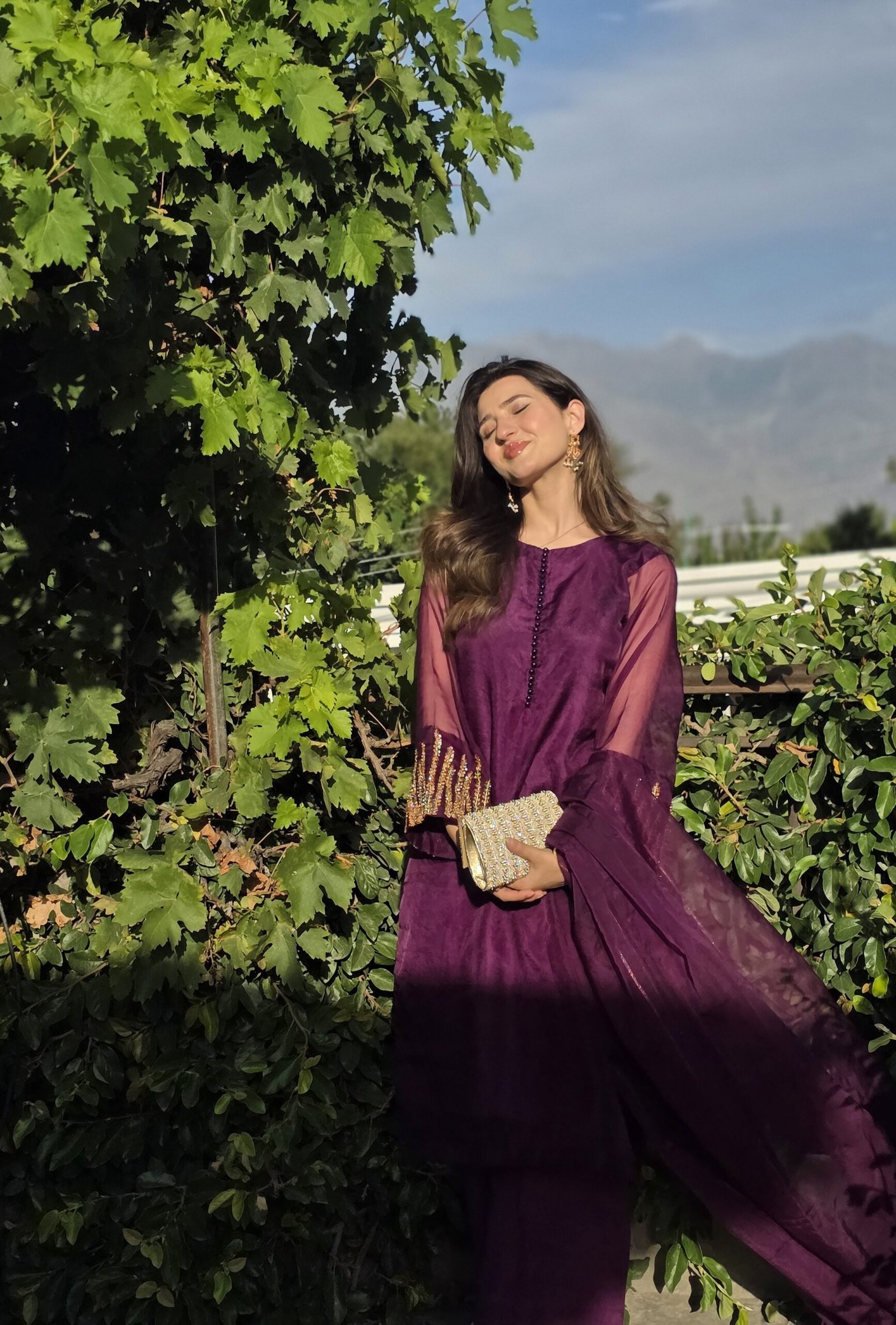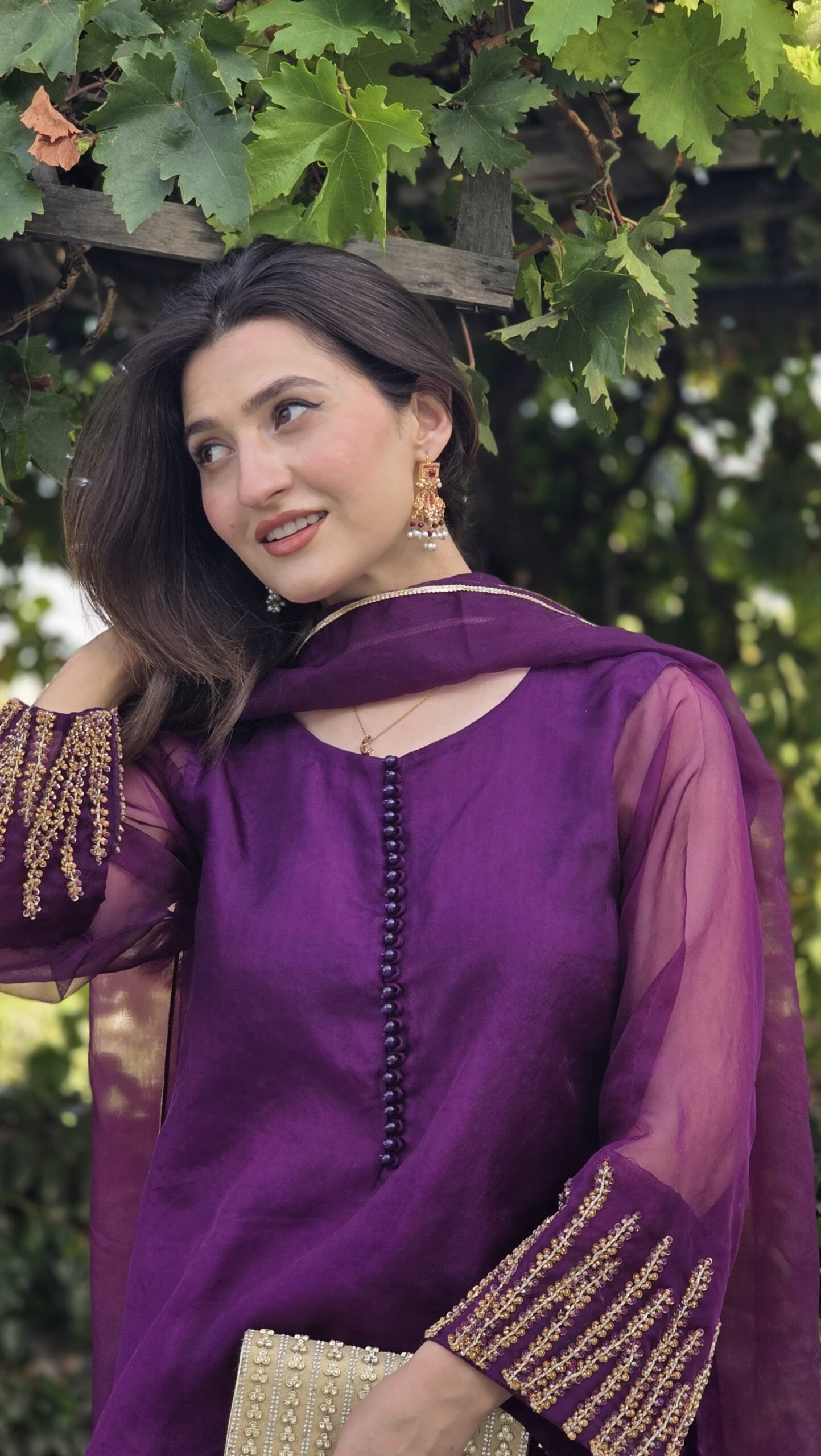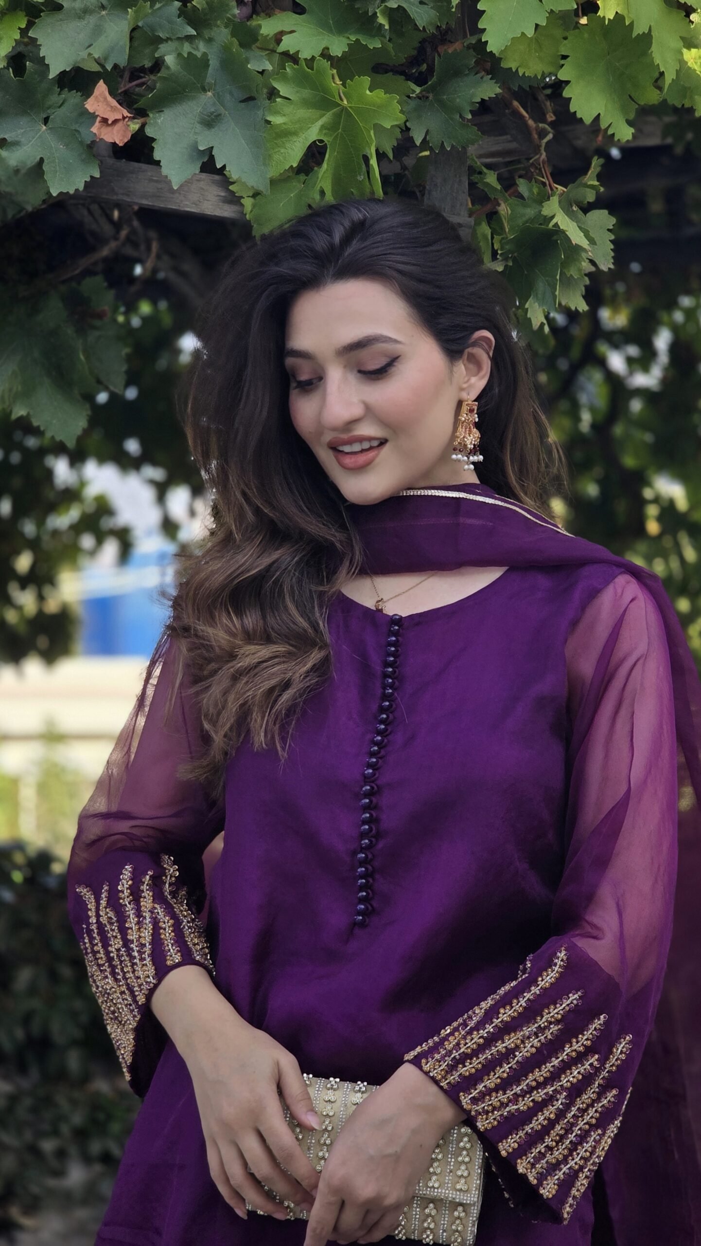 Purple Three-Piece Ensemble features an organza shirt with a lops-style neckline and hand-embellished sleeves, paired with a raw silk trouser and an organza dupatta with tassels. A rich, elegant look perfect for special occasions.