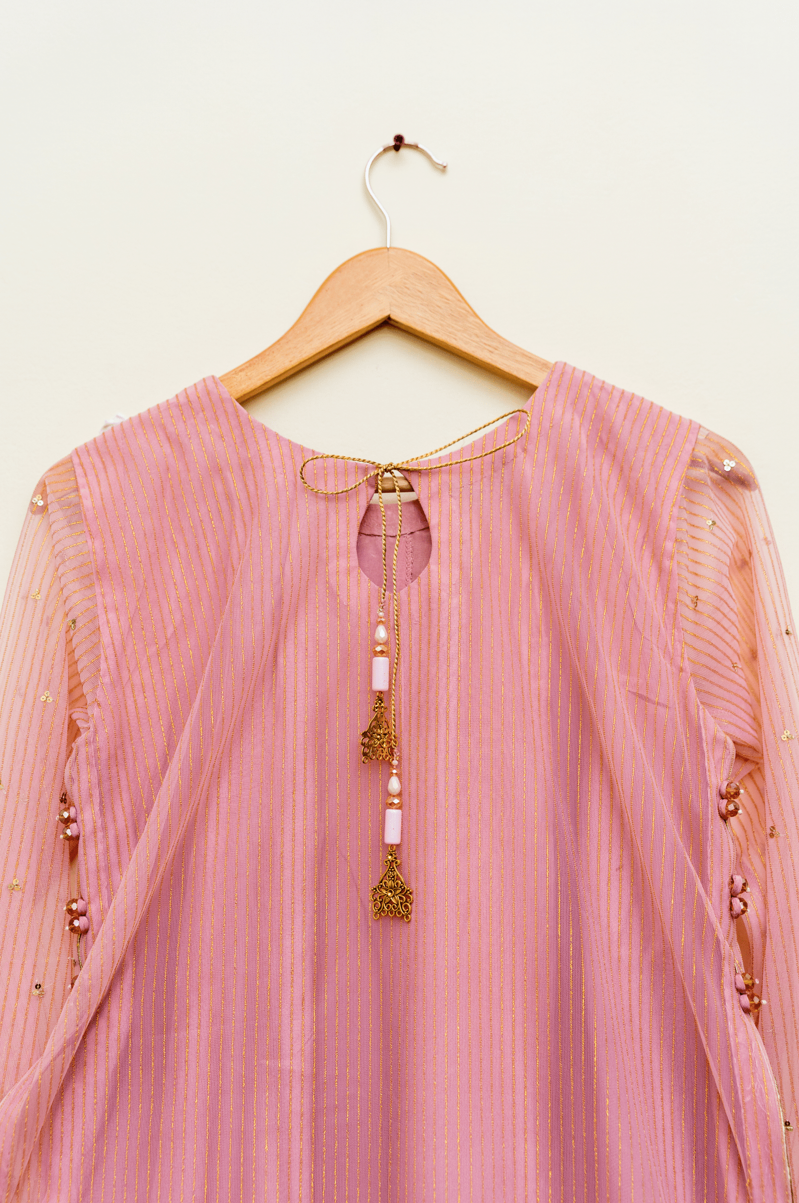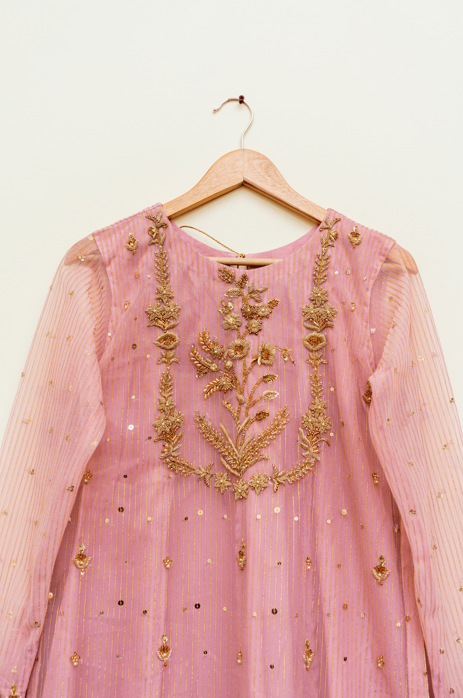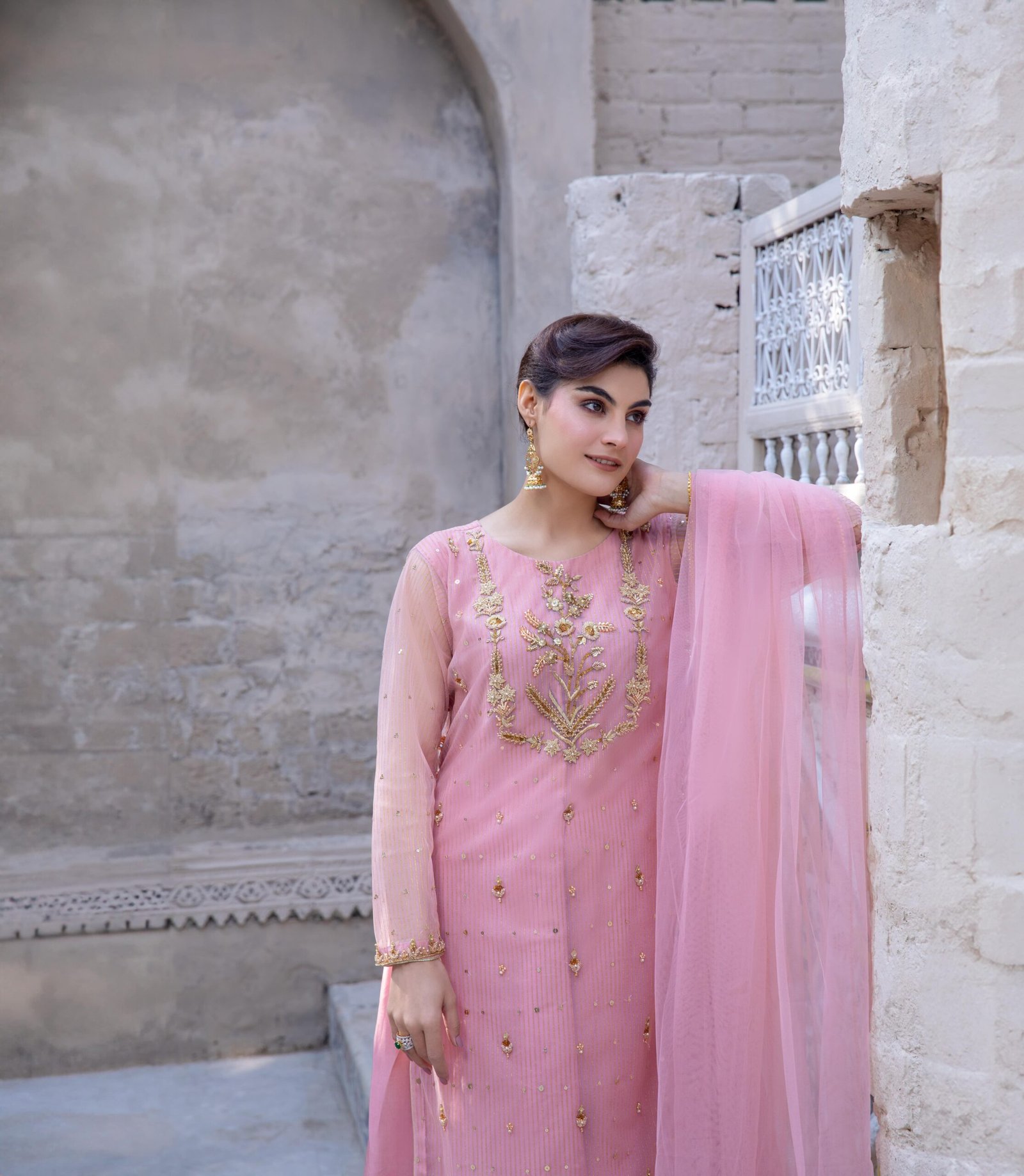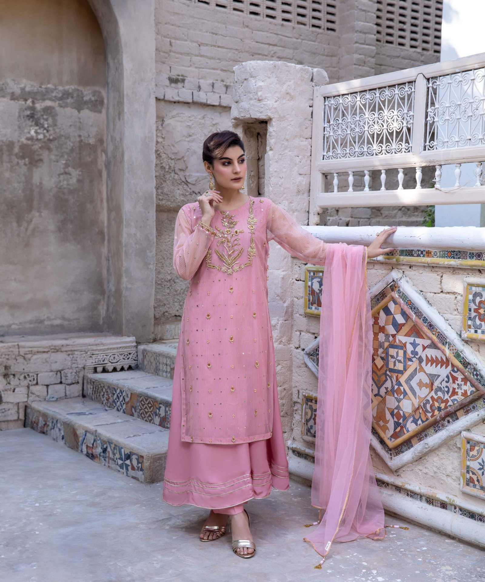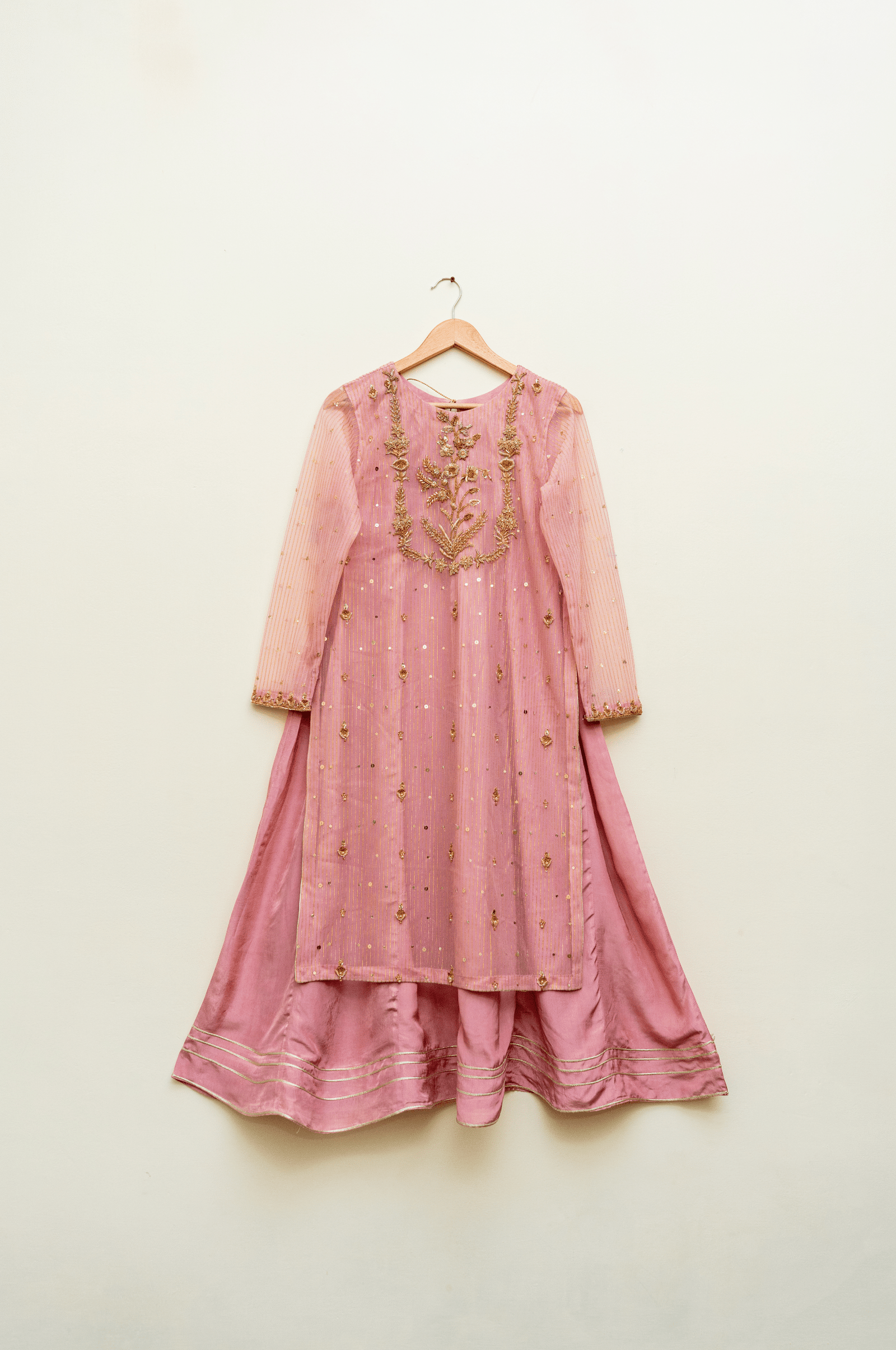 Paired with a matching net dupatta enhanced with tassels, and raw silk trousers for a graceful finish, this ensemble is perfect for weddings, festive occasions, and special gatherings. The soft pink hue adds to its charm, making it both romantic and refined.