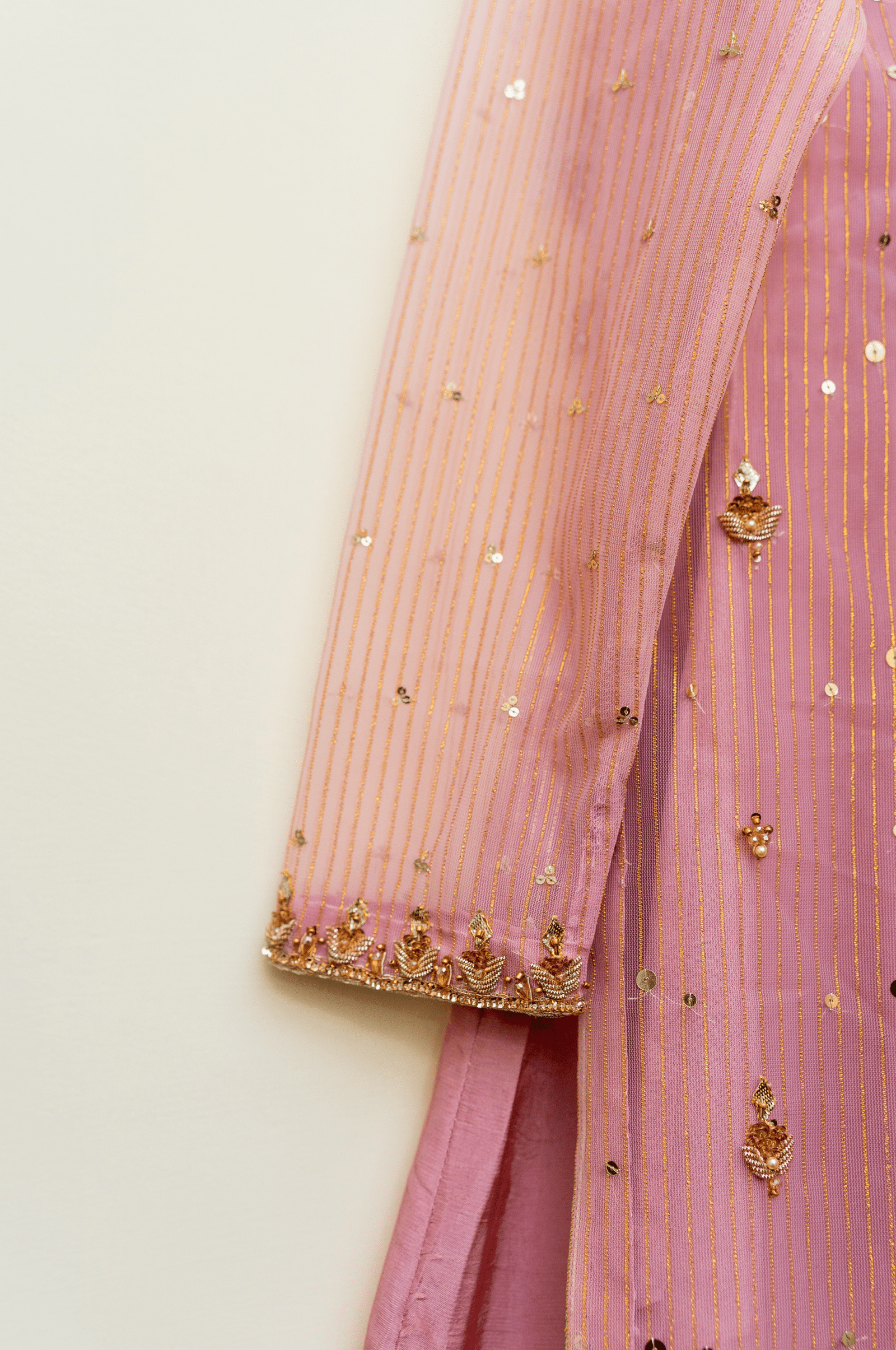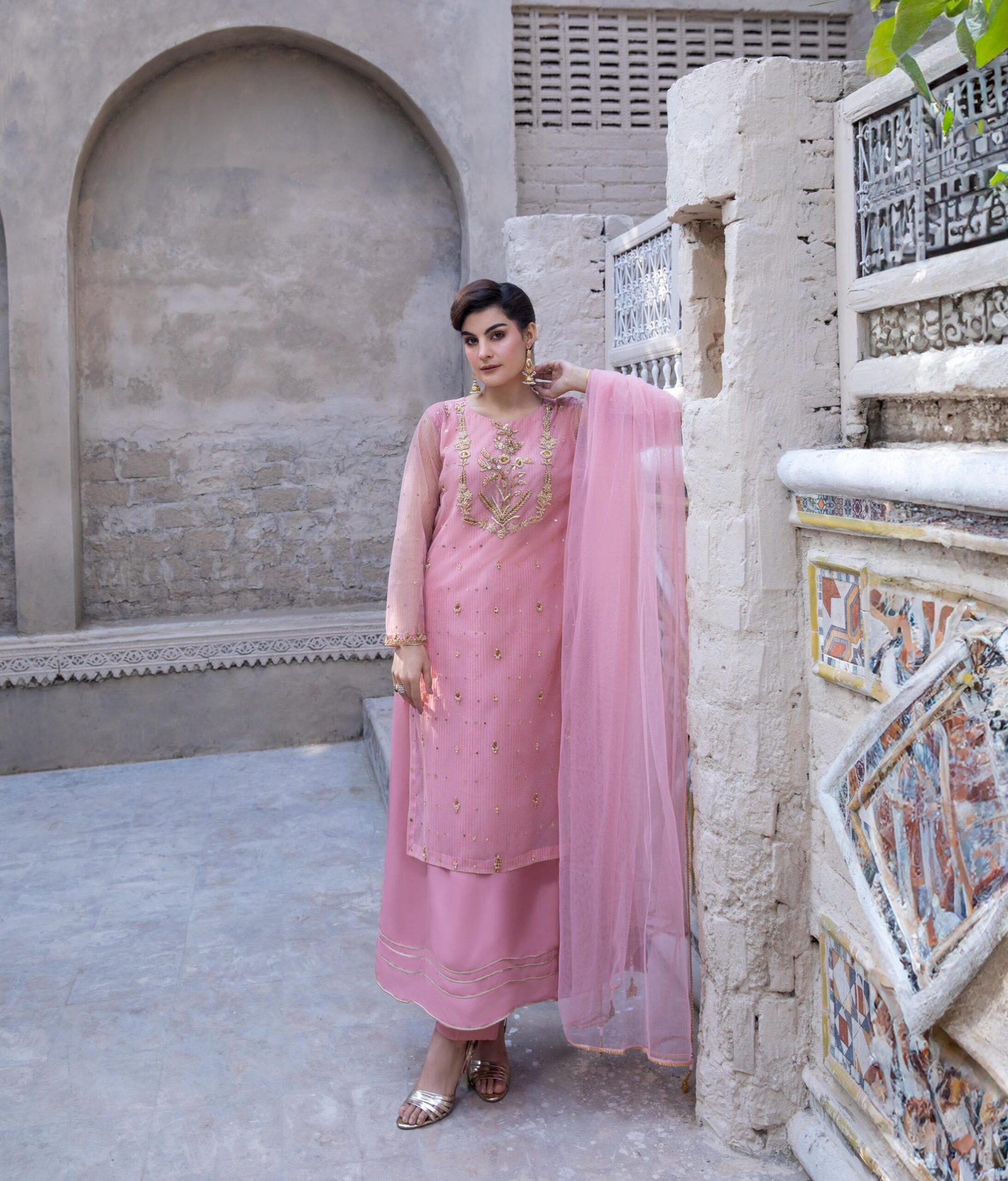 Pink Three-Piece Ensemble features a net shirt with an inner slip, neckline and boti embellishments in dabka, moti, crystal, sitara, and gota, paired with a raw silk trouser and a net dupatta with tassels. Soft, elegant, and effortlessly beautiful.
