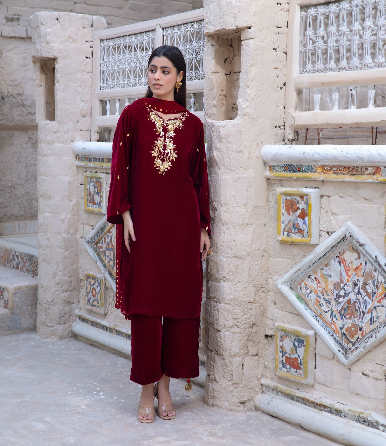 Maroon Velvet Three-Piece Ensemble is a refined expression of elegance and understated luxury. The velvet shirt features a beautifully crafted neckline design on the front, complemented by delicate boti work on the sleeves, adding depth and traditional charm to the rich maroon base.