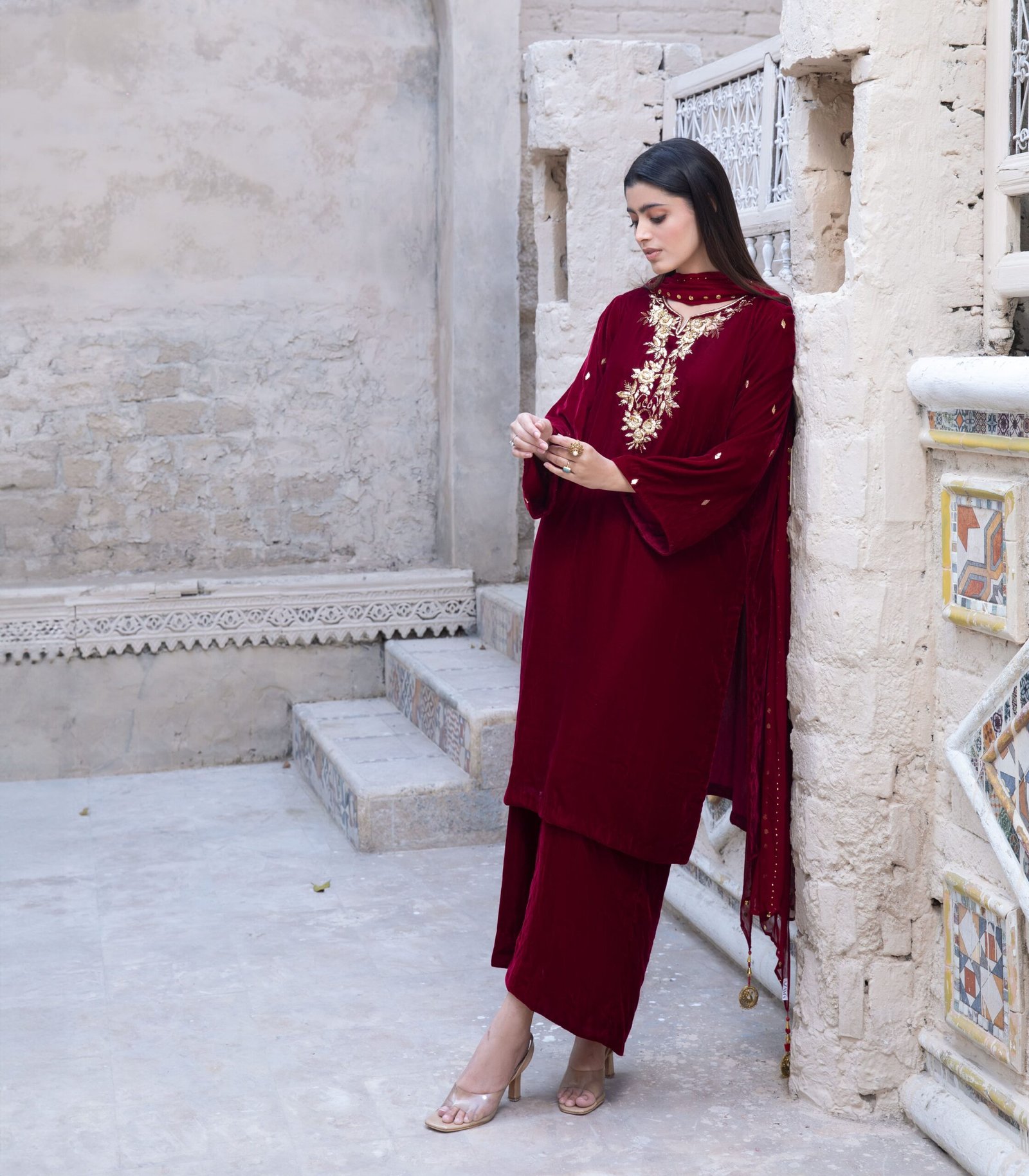 Paired with matching velvet trousers, this ensemble offers a cohesive and regal silhouette. The look is completed with a chiffon dupatta, adorned with striped line mukaish detailing and finished with elegant tassels, bringing a subtle shimmer and graceful movement to the outfit.