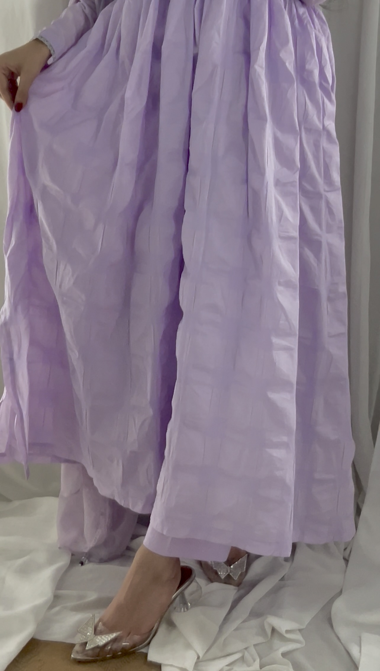 This elegant 3-piece outfit features a beautifully stitched lawn frock, styled with a graceful flare, paired with a matching lawn trouser and a soft chiffon dupatta. The frock is delicately hand-embellished with mirror work, wool thread embroidery, pearls, and sequins, adding a refined sparkle and an artisanal touch. Designed in a soothing pastel lavender shade, it brings a sense of freshness and sophistication, while the flowy silhouette ensures both comfort and effortless style. Paired with its lightweight chiffon dupatta, this ensemble becomes a versatile choice, making it perfect for festive gatherings, semi-formal events, and graceful daywear. A timeless piece that blends elegance with comfort, crafted for women who appreciate luxury with simplicity.