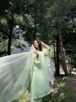 Paired with a lightweight organza dupatta, beautifully finished with charming tassels, this ensemble radiates sophistication and charm. The soft pista green hue enhances its ethereal appeal, making it a perfect choice for festive and formal occasions.