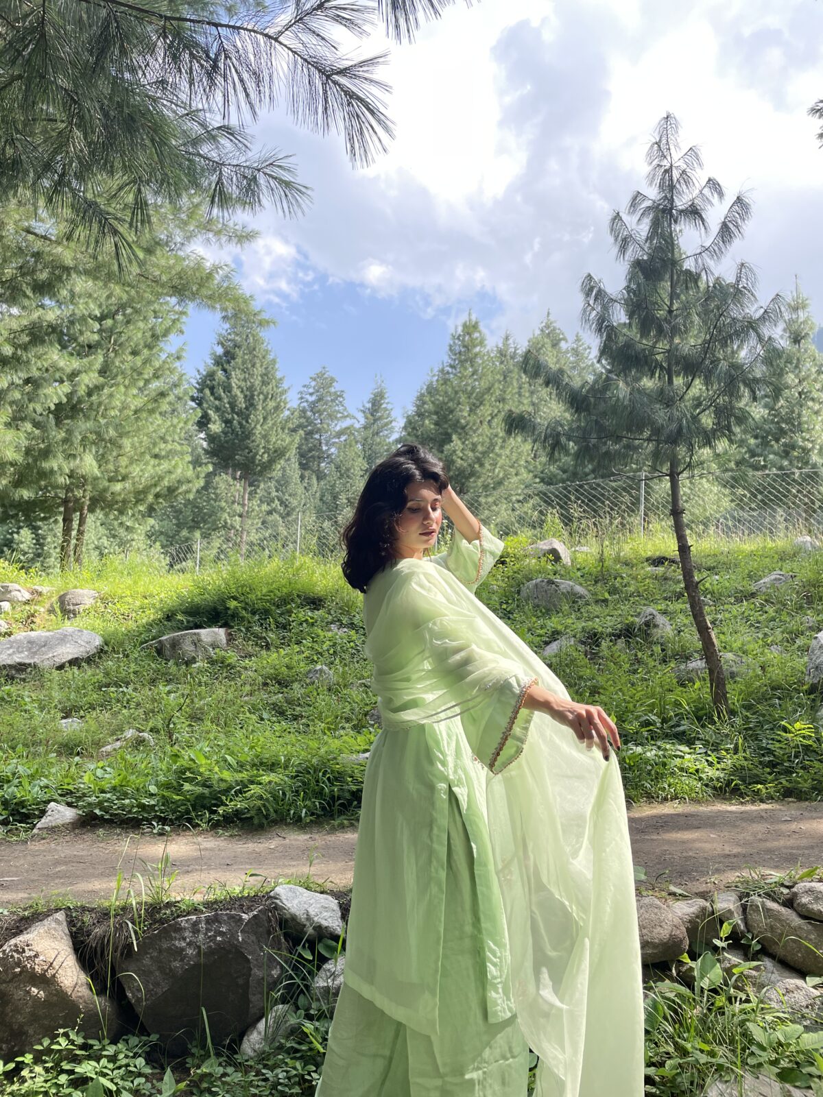 Pista Green Ensemble features a Korean silk shirt with hand-embellished silver gota work, paired with a light organza dupatta adorned with tassels. This two-piece outfit exudes grace and sophistication, perfect for any elegant occasion.